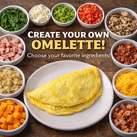 Build your own omelette just the way you like it at Ally’s Comfort Café in Davie, FL. Start by choosing your omelette base, then select how you like your eggs cooked and your preferred breakfast side. Customize your omelette with a wide variety of fresh vegetables, cheeses, and protein add‑ins to make it truly your own. Served fresh and made to order for breakfast or brunch lovers.
